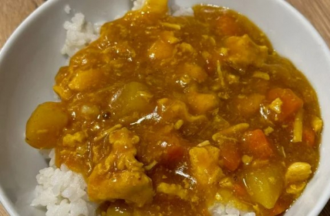 riso bianco , pollo al curry , ananas , cetriolo , ravanello , pomodoro , crauto viola , mais , arachidi tritate , salsa di soia , glassa sriracha