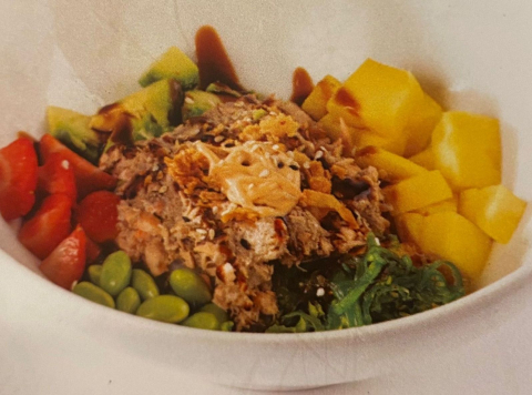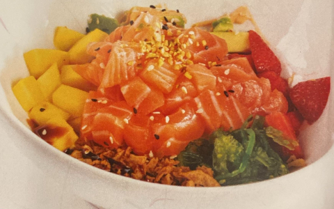 salmone , fragola , mango , avocado , gomawakame , cipolla frtitta , semi di sesamo , salsa teriyaki