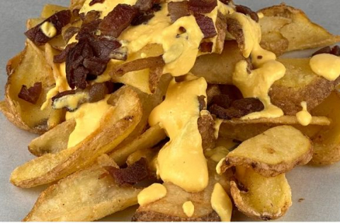 Tortilla di chips di mais condita con cheddar fuso, bacon croccante, cipolla di tropea fritta e salsa billis