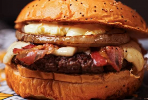 hamburger macina billis , doppio cheddar , triplo bacon , anelloni* di cipolla pastellati alla birra , salsa bbq special