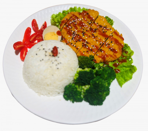 Con riso bianco, insalata, broccoli o spinaci, cotoletta di pollo e uovo marinato