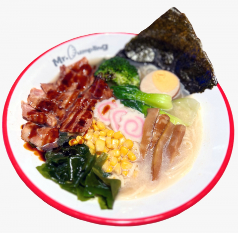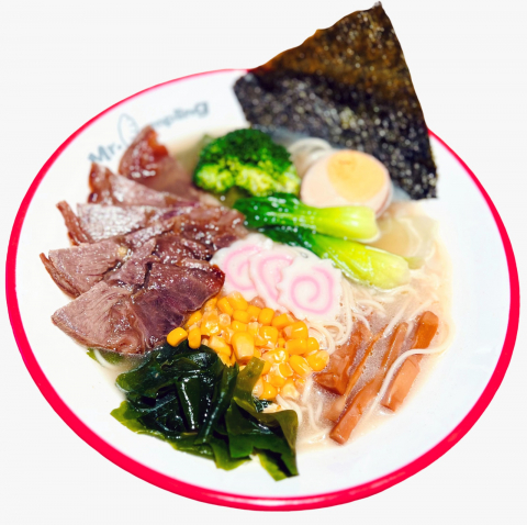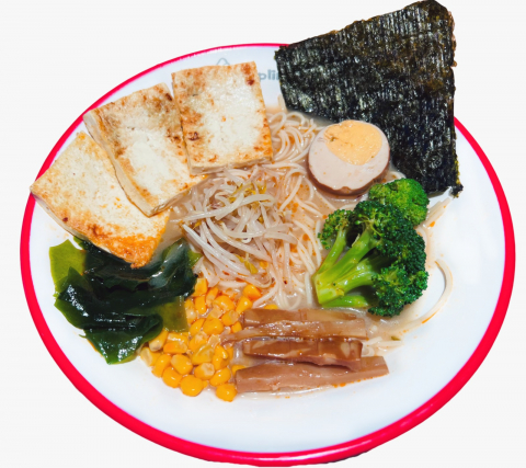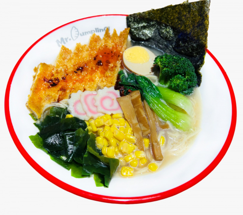 Brodo di carne, cotoletta di pollo*, salsa teriyaki, verdure e uovo marinato
