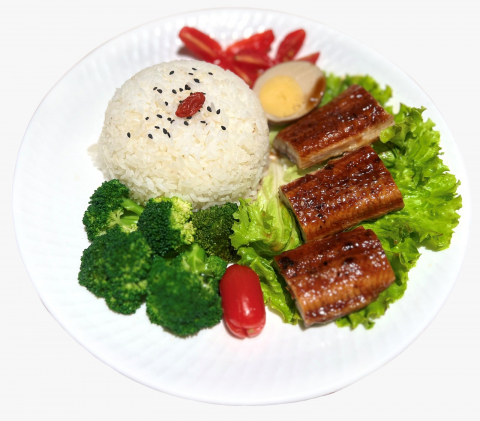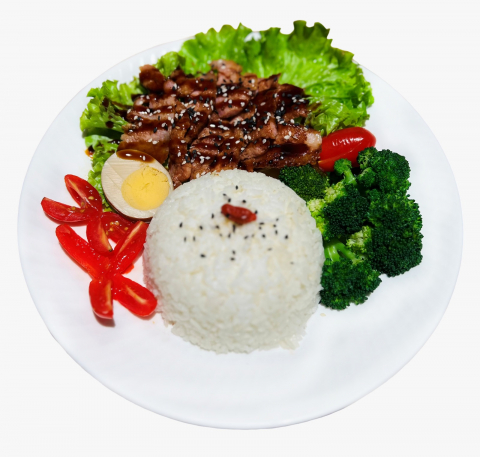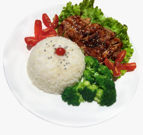 Con riso bianco, broccoli o spinaci, pollo teriyaki, cipolla, carote e uovo marinato