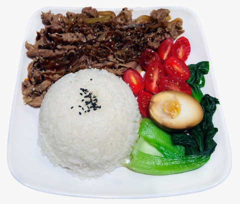 Con riso bianco, insalata, broccoli o spinaci, carne di manzo, cipolla, carote e uovo marinato