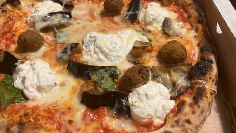 Metà calzone e metà pizza, ripieno con salsiccia e friarielli con aglio e peperoncino, fior di latte, pomodoro san marzano, melanzane fritte, pomodorino datterino, cipolla di tropea, provola, bocconcino di bufala, basilico e olio evo