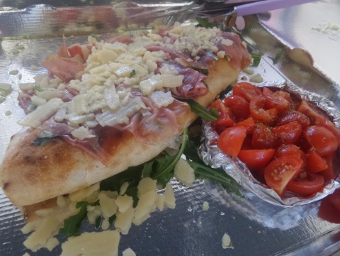 Ripieno di mozzarella e provola dolce con contorno di rucola pomodorini prosciutto crudo e pomodorini all'origano