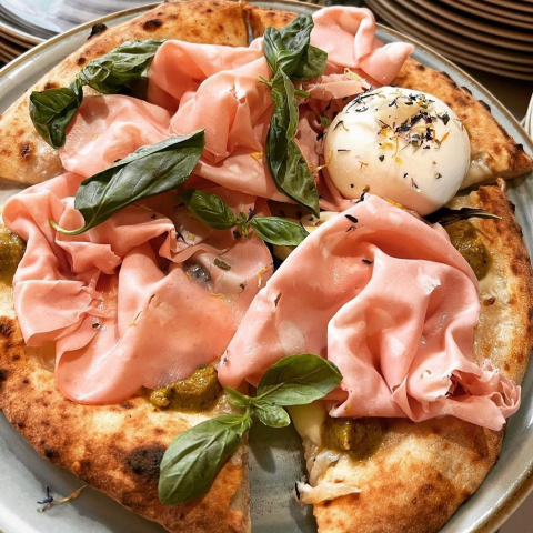mozzarella , pomodorini gialli , gorgonzola , crudo di parma , basilico , fico in conserva al peperoncino dolce