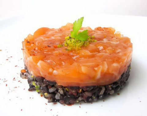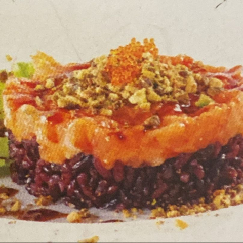 Tartare di salmone con riso venere, philadelphia guarnita con pistacchio e salsa teriyaki