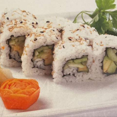 Roll di riso venere farciti con avocado, philadelphia e insalata, guarniti con granelle di pistacchio