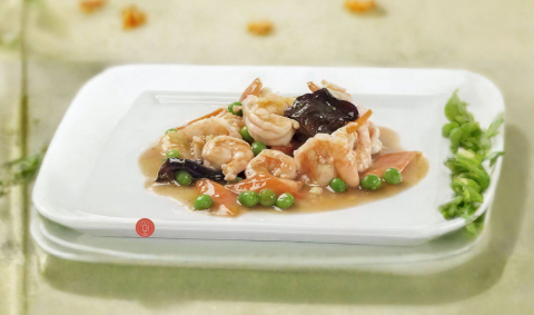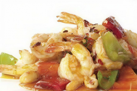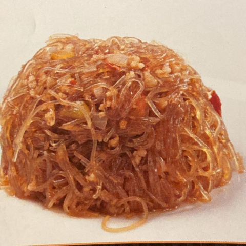 Spaghetti di riso saltato con gamberetti verdure miste e germogli di soia uova