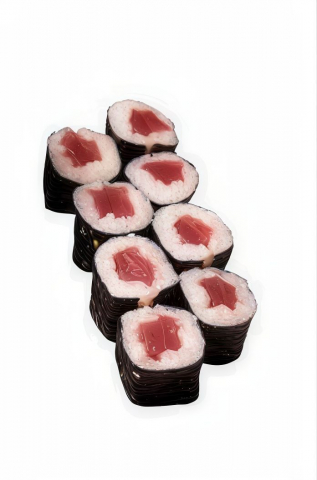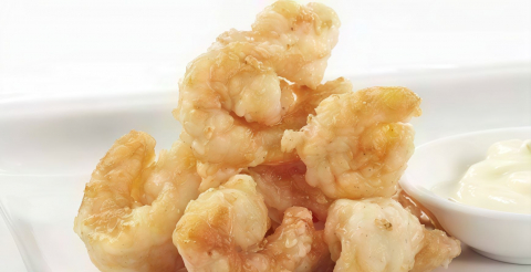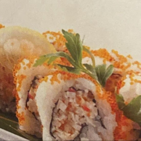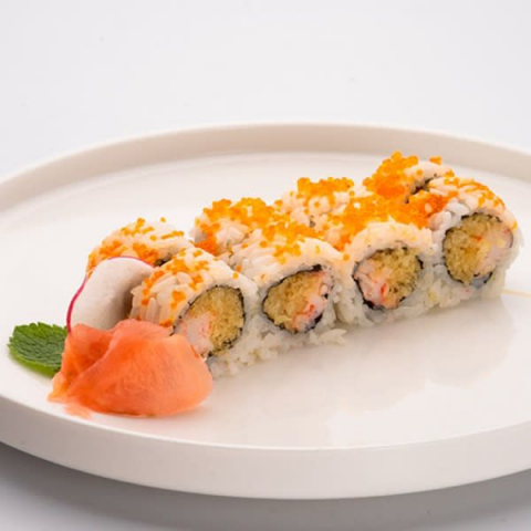 Roll di riso farciti con *gambero cotto, granelle di tempura, guarnito con tobiko e condito con salsa teriyaki