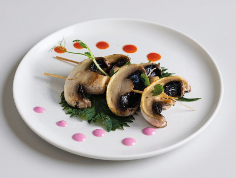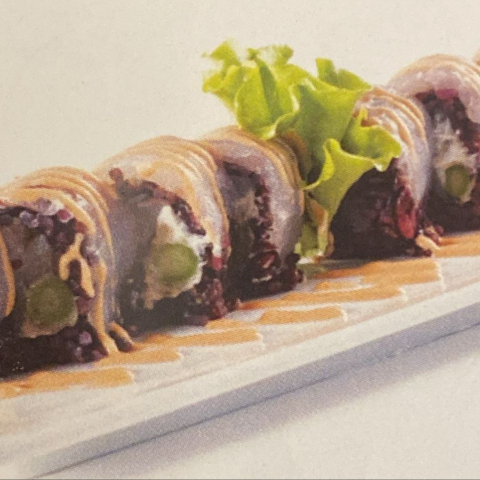 Roll di riso venere farciti con branzino, asparagi e philadelphia, guarniti con branzino e salsa piccante