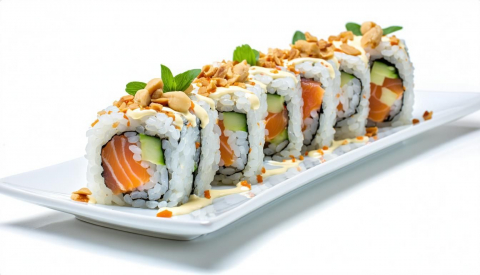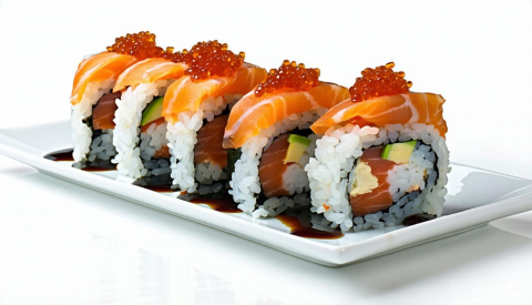 Roll di riso farciti con *gamberi in tempura, guarnito con salmone, fiori di zucca, ikura, maionese e salsa teriyaki