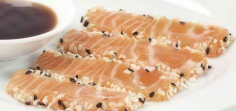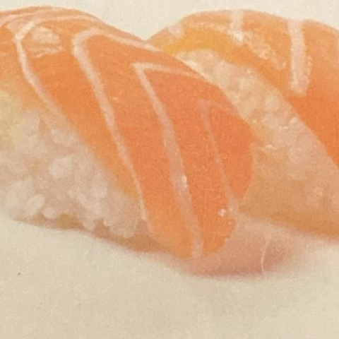 Roll di riso farciti con salmone saltato, philadelphia, guarnito con salmone scottato alla fiamma, condito con salsa