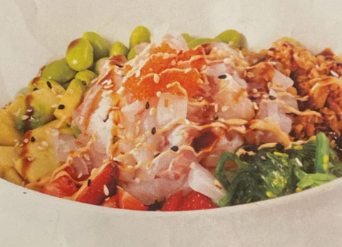 salmone , fragola , mango , avocado , gomawakame , cipolla frtitta , semi di sesamo , salsa teriyaki