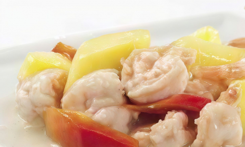 pesce bianco , fragola , edamame , avocado , goma wakame , cipolla fritta , tobiko , salsa piccante