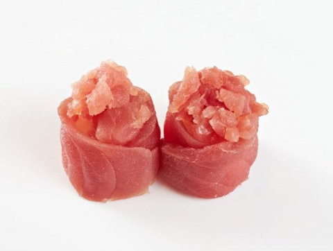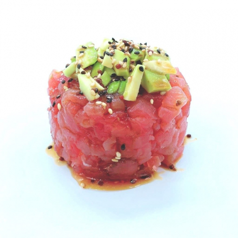 Roll di riso farciti con tonno, e avocado, guarniti con tonno scottato e salsa zafferano