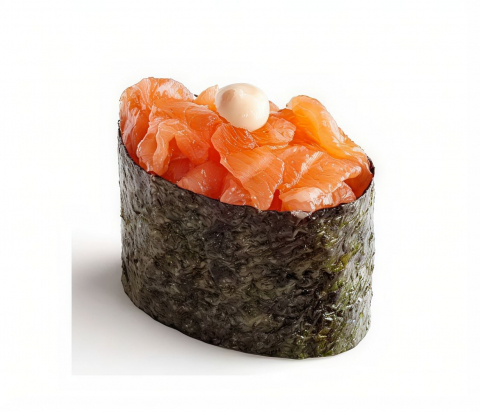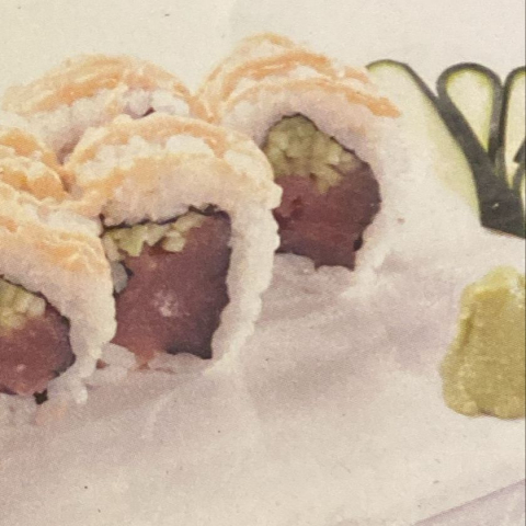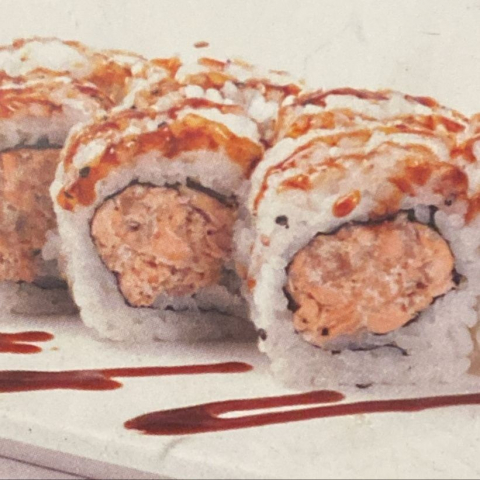 Roll di riso farciti con gambero fritto e *gamberetti, guarnito con salmone scottato e maionese e salsa teriyaki