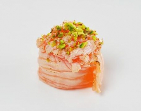 Avvolto con fettina di salmone scottato, farcito con tartare di salmone e pistacchio