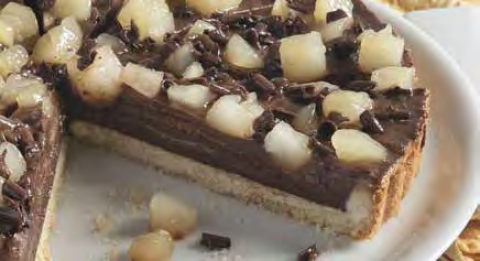 Fragrante pasta frolla con crema al cioccolato fondente, cubetti di pera 100% italiana e riccioli di cioccolato