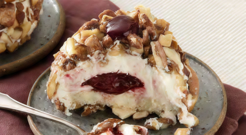 Dessert semifreddo con crema al gusto vaniglia, cuore morbido all’amarena, decorato con mandorle caramellizzate