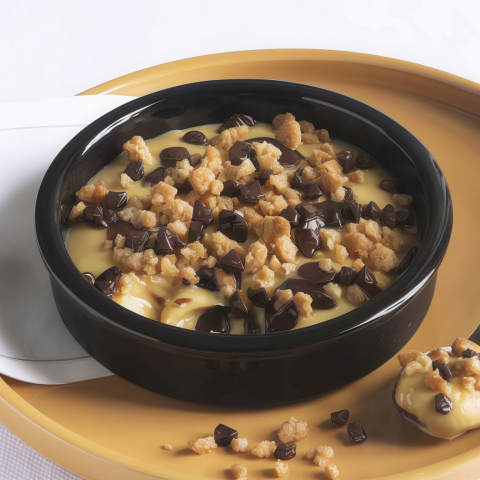Ricca crema al caramello salato con inclusioni di crema al cioccolato decorato con pepite di cioccolato e crumble al burro