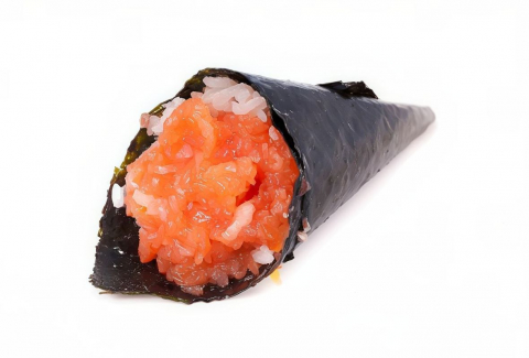 Hosomaki fritto con salmone guarnito con tartare di salmone e salsa piccante, senza riso