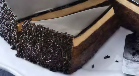 Crema con cioccolato con cacao monorigine dell’Ecuador, crunch alla nocciola e crema alla nocciola tra due strati di morbido Pan di Spagna al cacao, ricoperta da una gustosa glassa al cioccolato