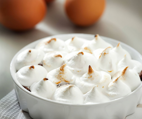 Gelato semifreddo alla nocciola con cuore di cioccolato liquido, decorato con nocciole pralinate e meringa