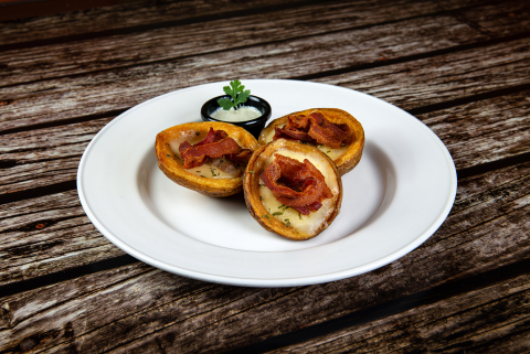 Patate al forno, ricoperte di formaggio, bacon e erba cipollina servite con salsa blue cheese
