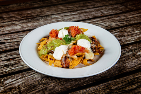 Chips di mais ricoperte di cheddar pulled pork, guacamole, sour cream, pico de gallo, chipotle e coriandolo. a scelta con formaggio fuso oppure da comporre e scaldare al microonde