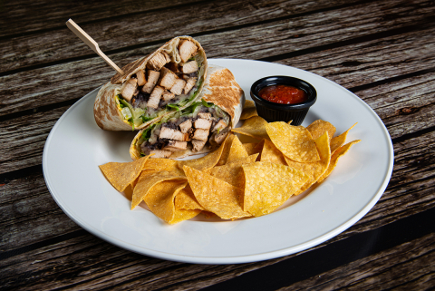 Tortilla di grano farcita con pulled pork, salsa bbq, riso mex (piccante), coleslaw e insalata, servito con chips di mais