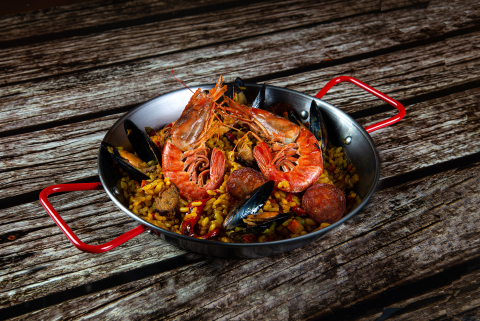 Paella messicana con riso, gamberoni, cozze, pollo, filetto di maiale, salame piccante e peperoni