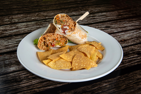 Tortilla di grano farcita con "carne" vegetale, riso mex, pico de gallo, guacamole, crauto rosso, maionese vegana al chipolte Chips