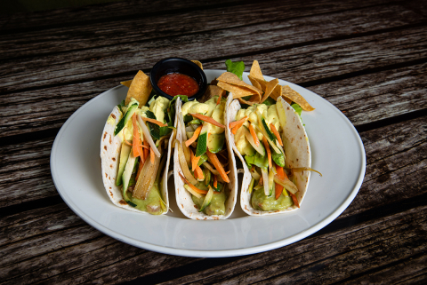 Tre tortillas di grano farcite con "carne" vegetale, mais, pico de gallo, salsa thousand island, insalata, sour cream, salsa sriracha e chips
