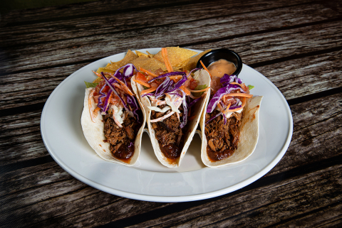 Tre tortillas di grano farcite con pulled pork, coleslaw, insalata, pico de gallo, salsa bbq, servito con chips di mais