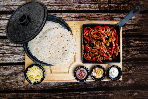 Manzo marinato, grigliato e tagliato a striscioline, servito su piastra rovente con cipolle e peperoni dolci con contorno di guacamole, pico de gallo, purea di fagioli neri, formaggio