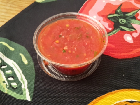 Avocado, cipollotto, pomodoro, lime, peperoncino piccante, coriandolo. Servito con chips di mais.