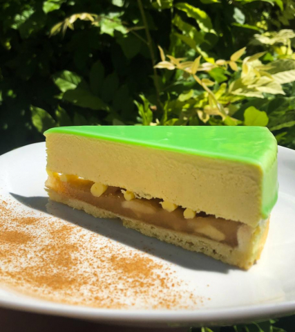 Frolla artigianale composta di mele al profumo di cannella, bavarese alla cannella e glassa lucida al cioccolato