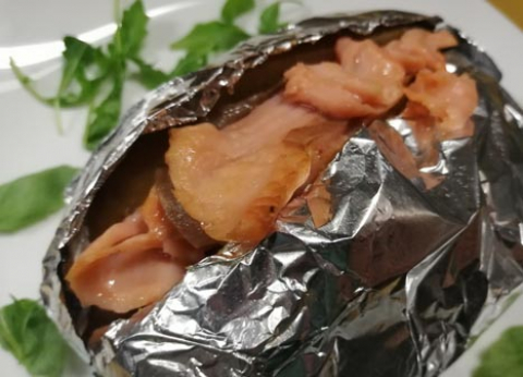 Patata al forno ripiena di cheddar irlandese, smoked cheese, seaweed cheese, Cashel Blue e fontina