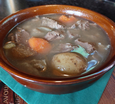 Il tradizionale stufato di agnello ervito in brodo con patate, carote e timo