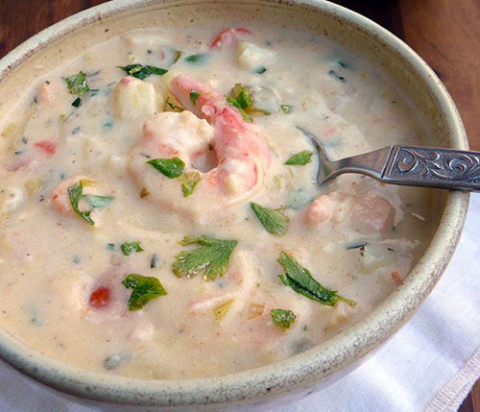 Zuppa di pesce irlandese fatta in casa con cozze, gamberi, salmone, merluzzo e panna fresca. Viene consegnato in confezione riciclabile, lavabile e utilizzabile in microonde.