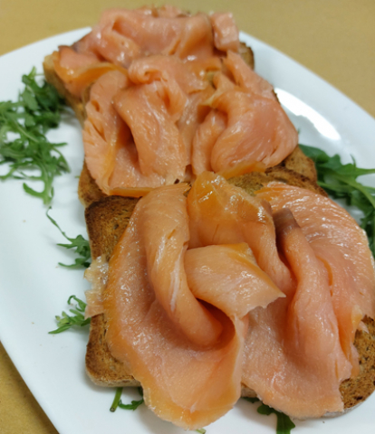 Salmone affumicato su bruschette di pane cucinato con la Guinness