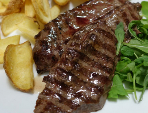 Bistecca di Angus irlandese di prima scelta (200 gr.), servita con un contorno di patate fritte.