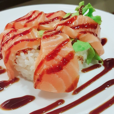 Riso nero, gambero fritto, maionese, rivestito di carpaccio di salmone e salsa teriyaki