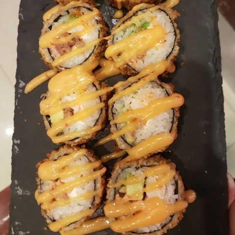 Salmone, avocado, tobiko, polpa di granchio, gamberetti, Philadelphia impanato fritto all’esterno